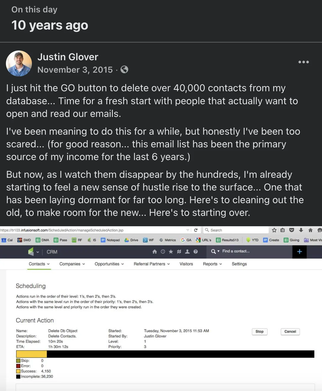 I deleted (literally deleted) hundreds of thousands of dead subscribers. Hard-earned leads, gone. Painful lesson learned.